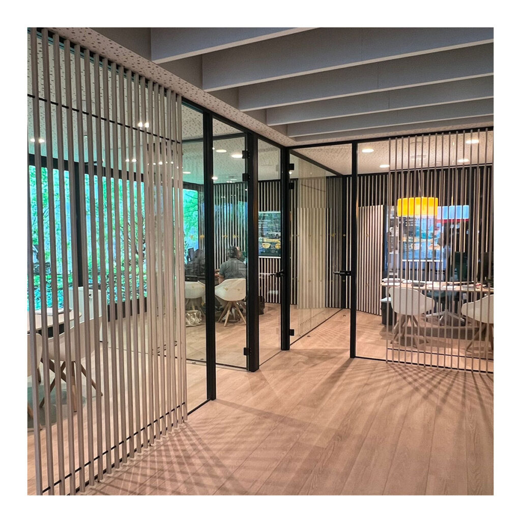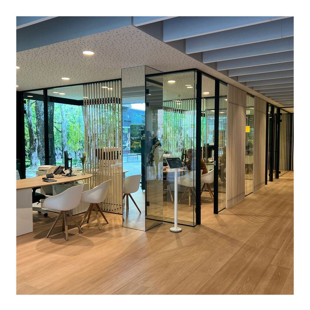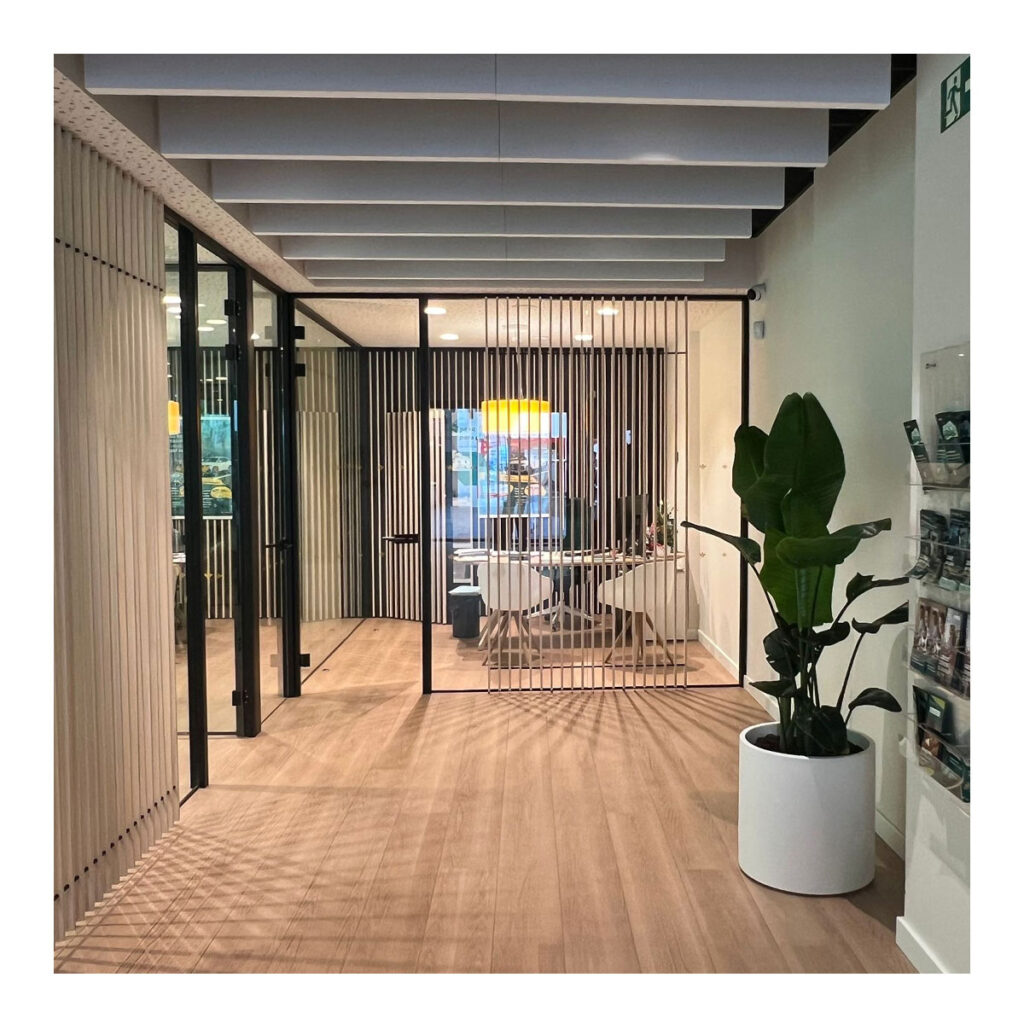 Los espacios se han organizado en recepción, zona de atención al cliente y despachos privados, donde el uso de cristales y listones de madera aporta privacidad sin renunciar a la amplitud ni a la luz natural.