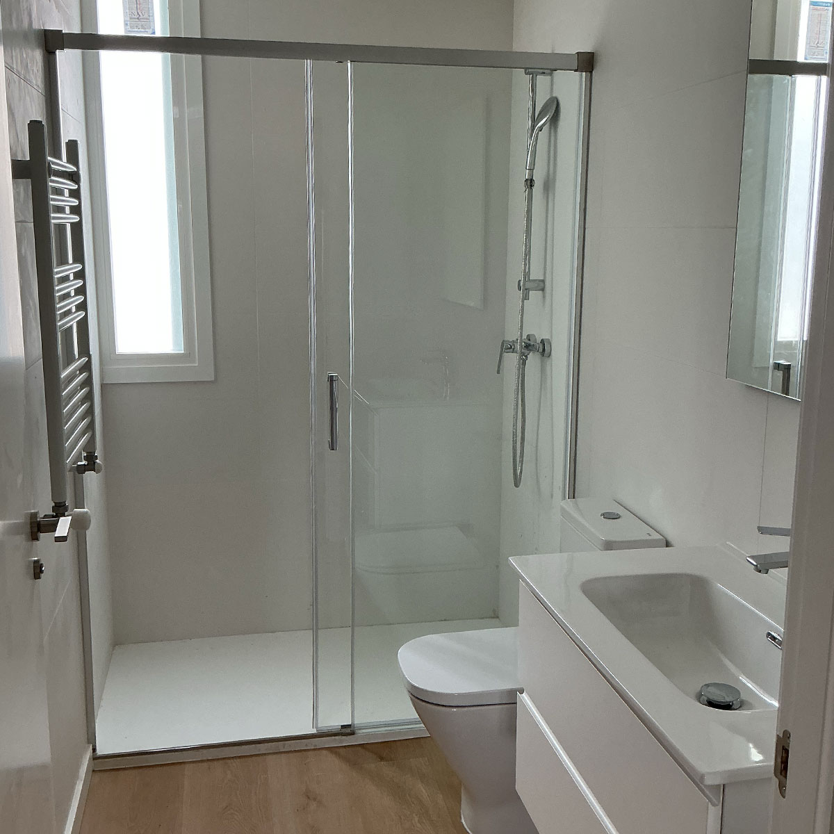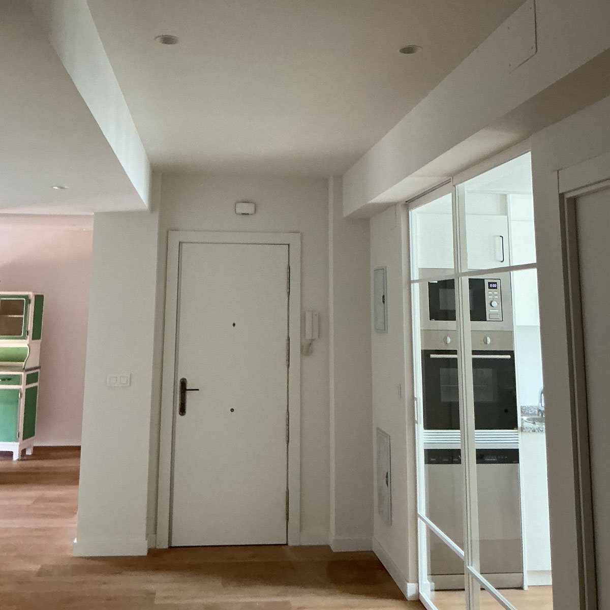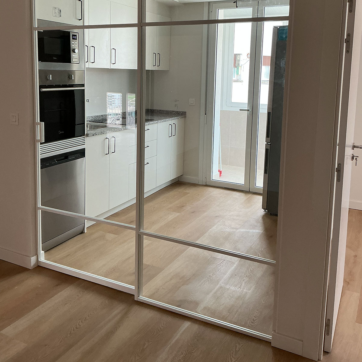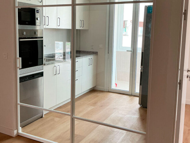 La cocina se ha integrado visualmente con el resto de la vivienda mediante un cerramiento acristalado tipo industrial, creando ambientes más abiertos y conectados. Hemos renovado por completo los suelos, la iluminación y la carpintería interior para adaptarse a los gustos y necesidades del cliente